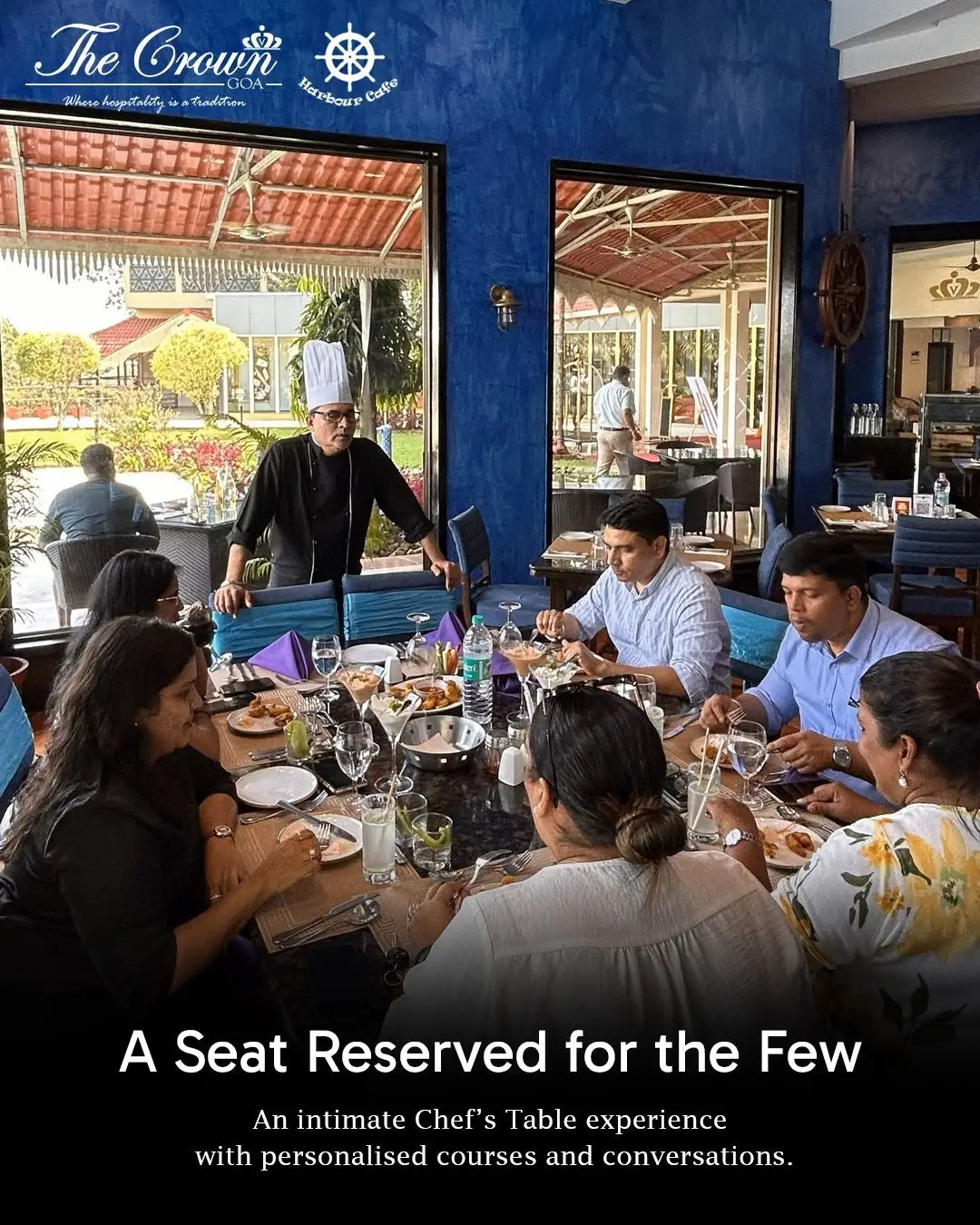 Step into an exclusive Chef’s Table experience at Harbour Café, The Crown Goa, where every dish is thoughtfully curated and personally presented. Enjoy intimate conversations, bespoke courses, and a warm, elegant setting designed for a select few. It’s not just dining—it’s a memorable journey of flavours, stories, and refined hospitality.