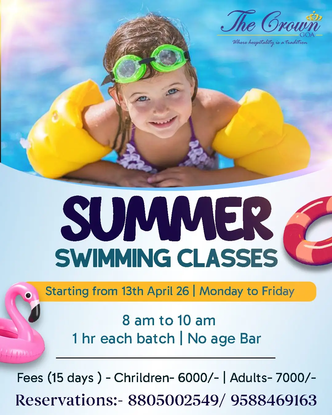 Beat the heat with exciting summer swimming classes at The Crown Goa. Designed for all age groups, our sessions focus on building confidence, technique, and fun in the water. With expert guidance and a safe environment, every class promises learning, laughter, and refreshing moments to make your summer truly unforgettable.